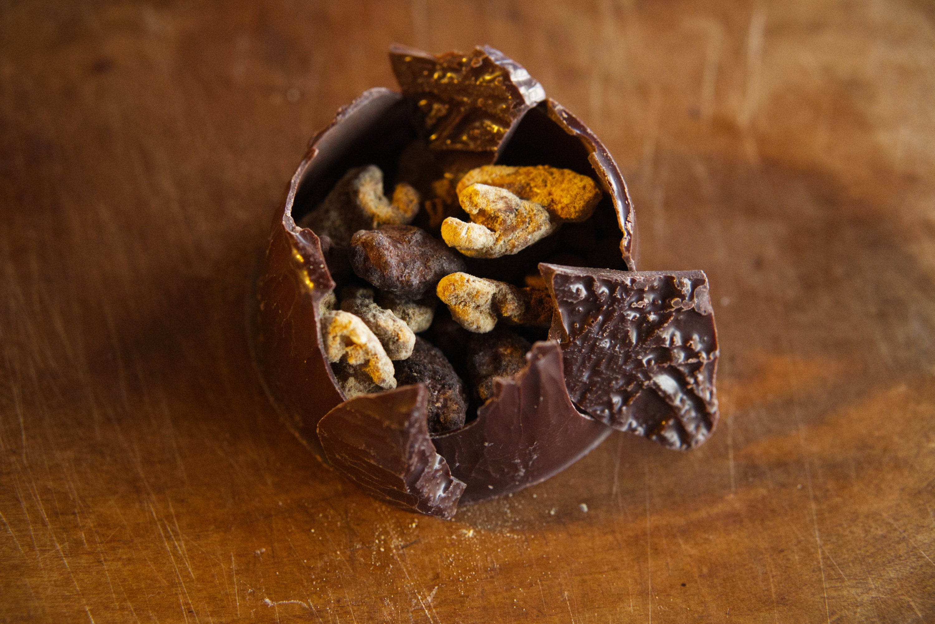 外側の殻を割ると中にアーモンドやくるみが出てきます